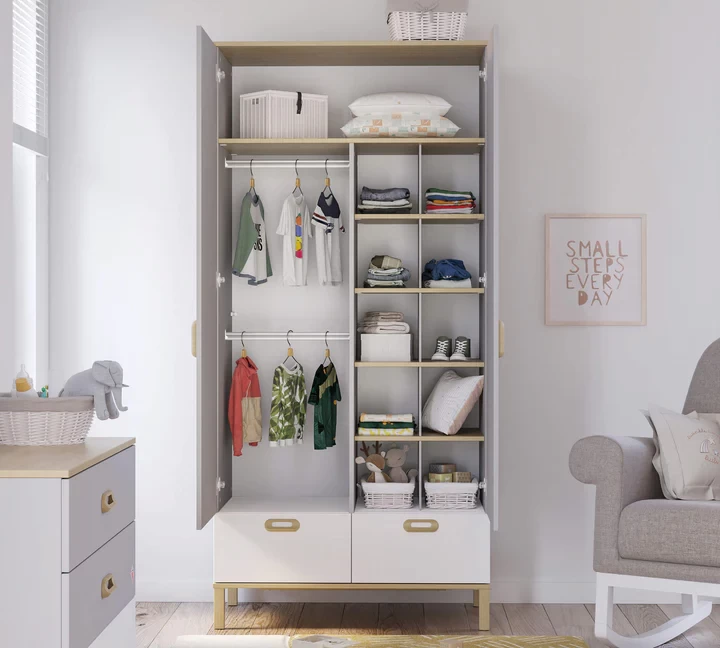 When your baby's needs are less or when you want to save space in narrow rooms, Mino Baby 2 Doors Wardrobe is exactly the solution you need. Mino Baby 2 Doors Wardrobe offers a wide range of solutions consisting of 1 hanger, plenty of shelves and 2 drawers.
