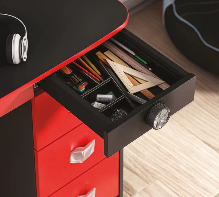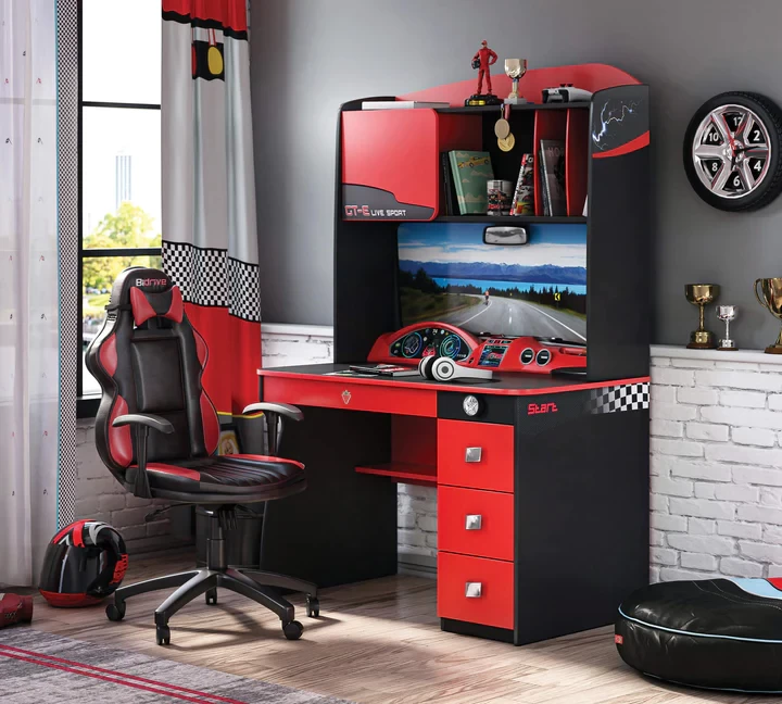 Adorning the dreams of adventurous children, Champion Racer draws attention with its racing car themed concept unit table. The table with the concept unit, which has an interior design of a striking red or black race car, helps children to use their imagination as they wish. In this design, which has both a drawer and a shelf arrangement, there is ample storage space for books at home. In addition, everything you need is at your fingertips with the bag hanger, the pen holder inside the drawer and the rear view mirror details.
