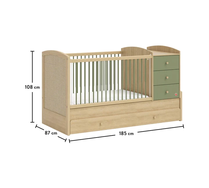 The crib and the lower drawer are compatible with bedding measuring 80x177 cm and sleep sets measuring 80x130 cm, respectively, and their high-quality structure ensures years of enjoyable use.